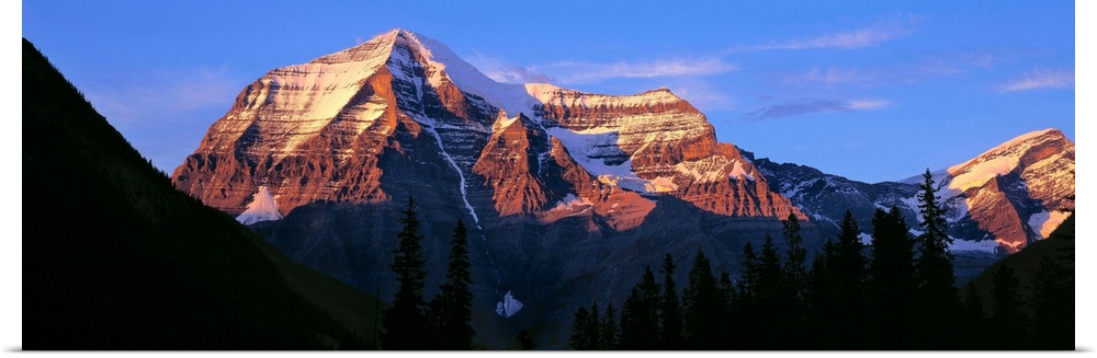<p>Canada, British Columbia, Mt Robson. The striation on Mount Robson, a World Heritage Site, is accentuated by the sunset light, in British Columbia, Canada.</p>