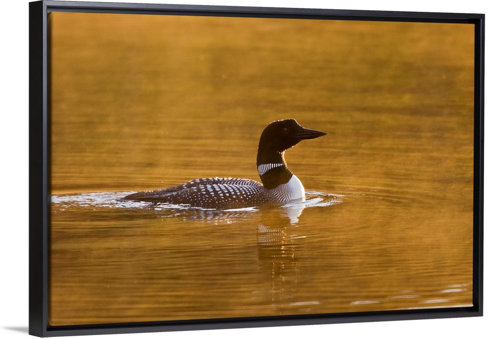<p>North America, Canada, British Columbia near Kamloops, Common Loon (Gavia immer) on lake at sunrise with steam rising, June</p>