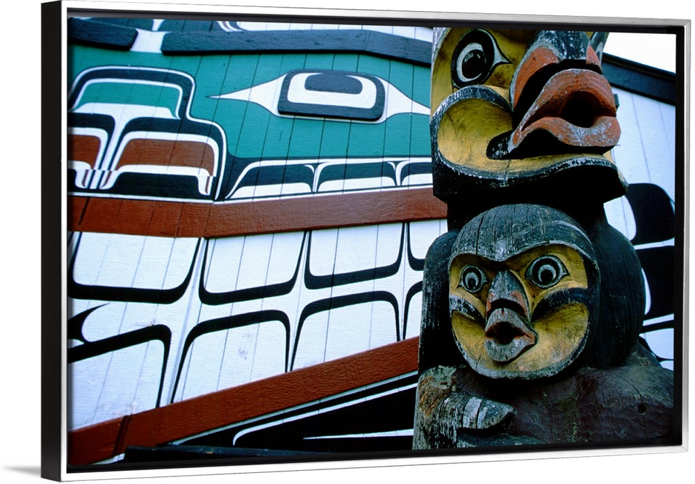 <p>North America, Canada, British Columbia, Victoria, Thunderbird Park. Native totem poles located in downtown park in front of clan house.</p>