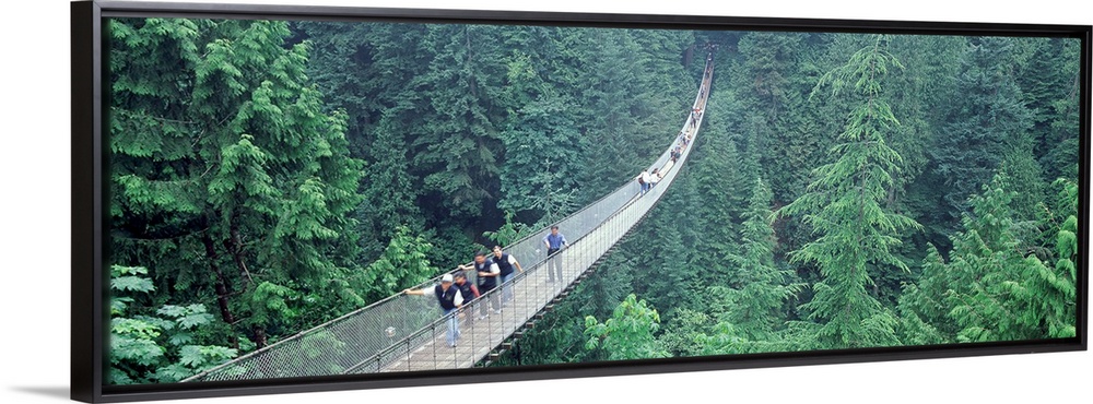 <p>Long horizontal photo on canvas of people walking across a long bridge that runs through the top of a forest.</p>