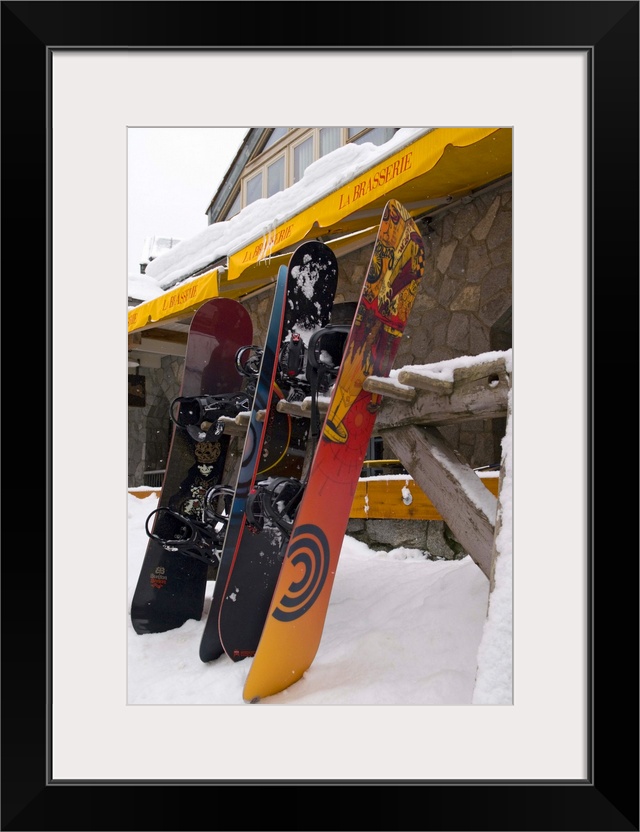 <p>CA, BC, Whistler Village. Snowboards outside cafe in fresh snow</p>