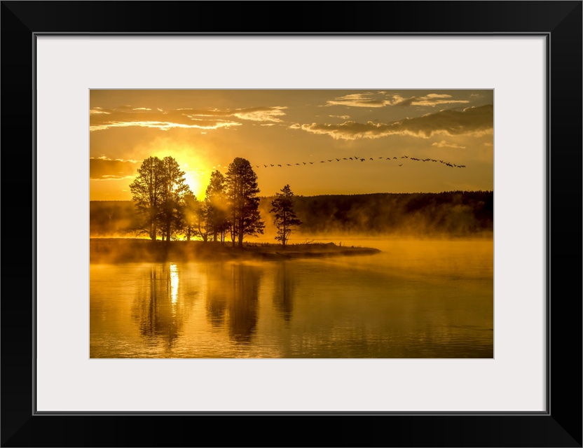 <p>Canada geese (Branta canadensis) flying above the Yellowstone River in Hayden Valley with the golden light of sunrise reflecting the trees in the water, Yellowstone National Park Wyoming, United States of America</p>