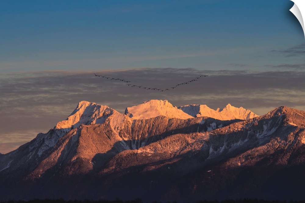 <p>Canada geese (Branta canadensis) flying in their V formation towards Mount Cheam in the Fraser Valley. British Columbia, Canada.</p>