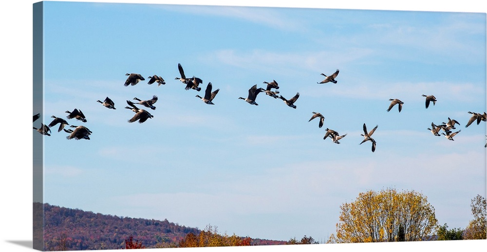 <p>Canada geese (Branta canadensis) in flight in a blue sky with cloud and autumn coloured foliage on the hills below; Fulford, Quebec, Canada</p>