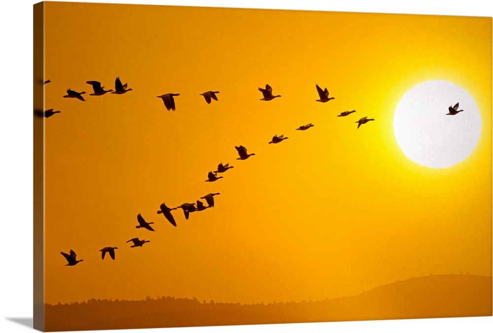 <p>A flock of geese is pictured in V formation as they fly high in the sky with a large sun in the background.</p>