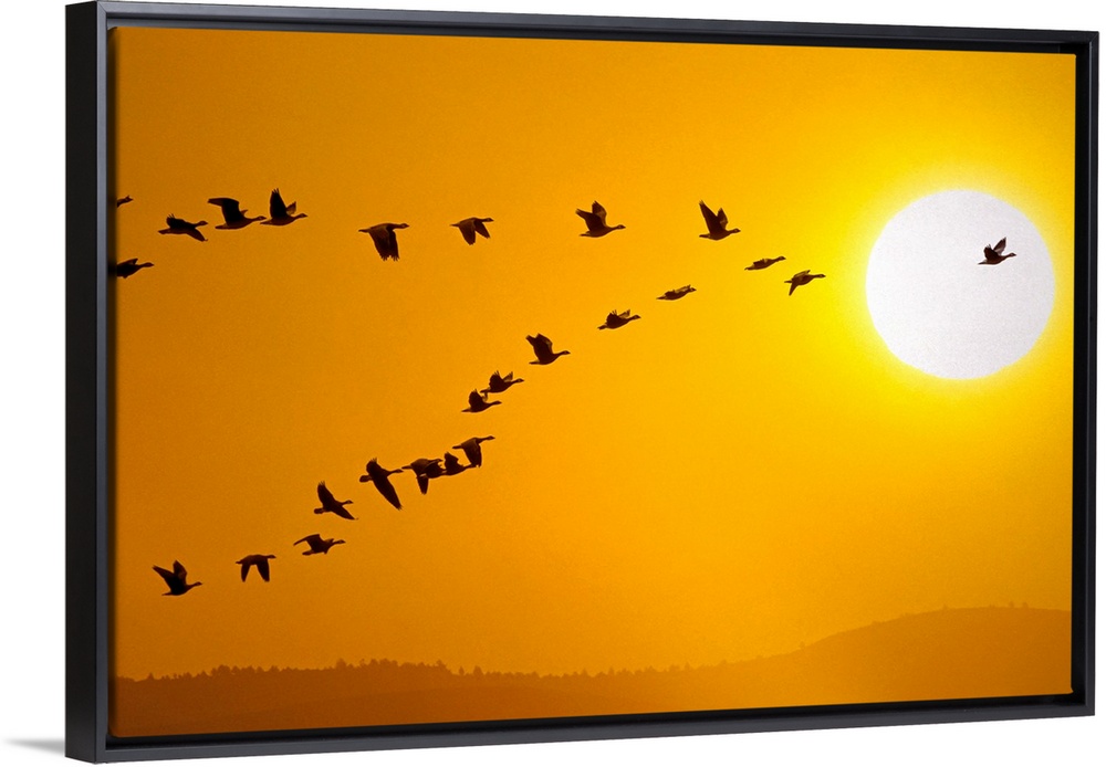 <p>A flock of geese is pictured in V formation as they fly high in the sky with a large sun in the background.</p>
