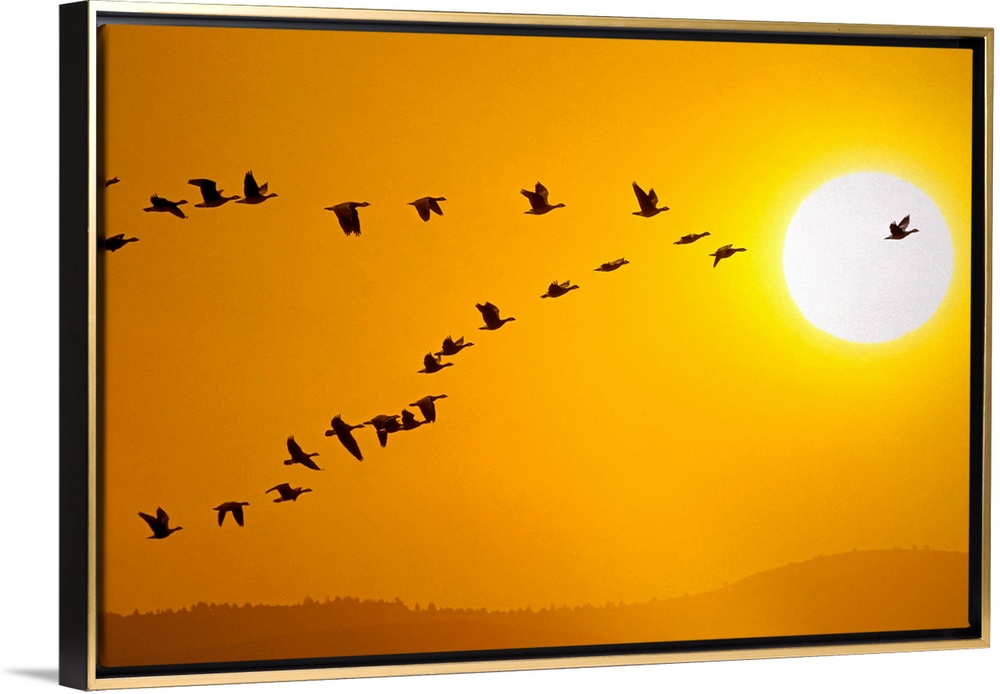 <p>A flock of geese is pictured in V formation as they fly high in the sky with a large sun in the background.</p>