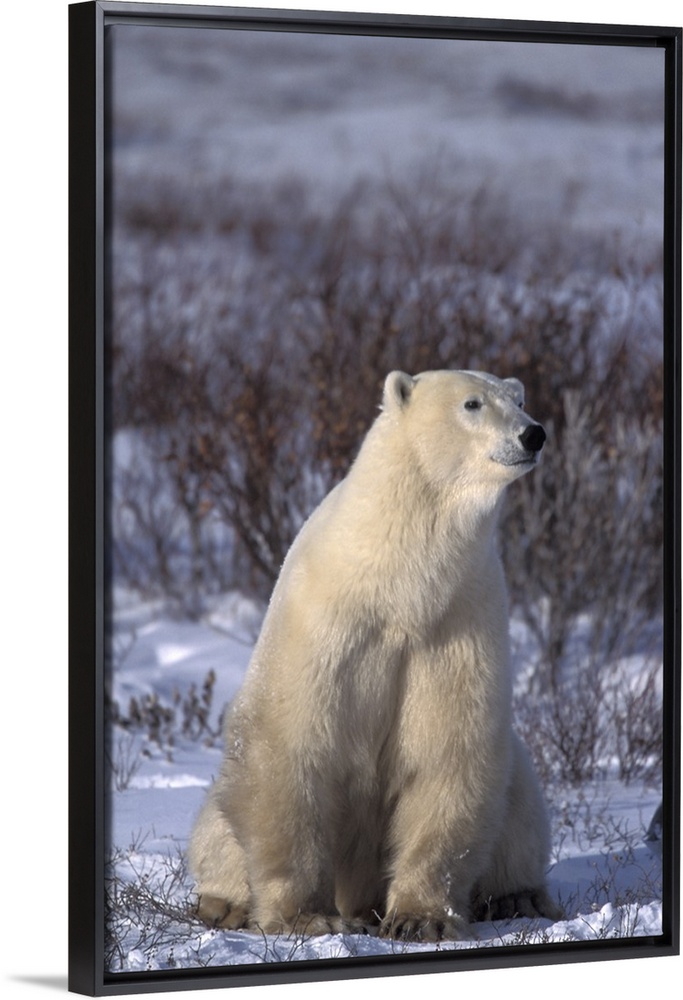 <p>NA, Canada, Manitoba, Churchill.A polar bear (Ursus maritimus) sits in a dog-like pose near Hudson Bay</p>