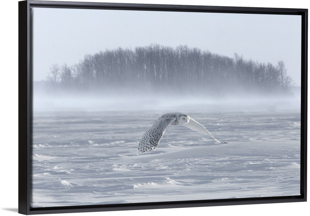 <p>Canada, Ontario, Barrie. Snowy owl in flight over water.</p>