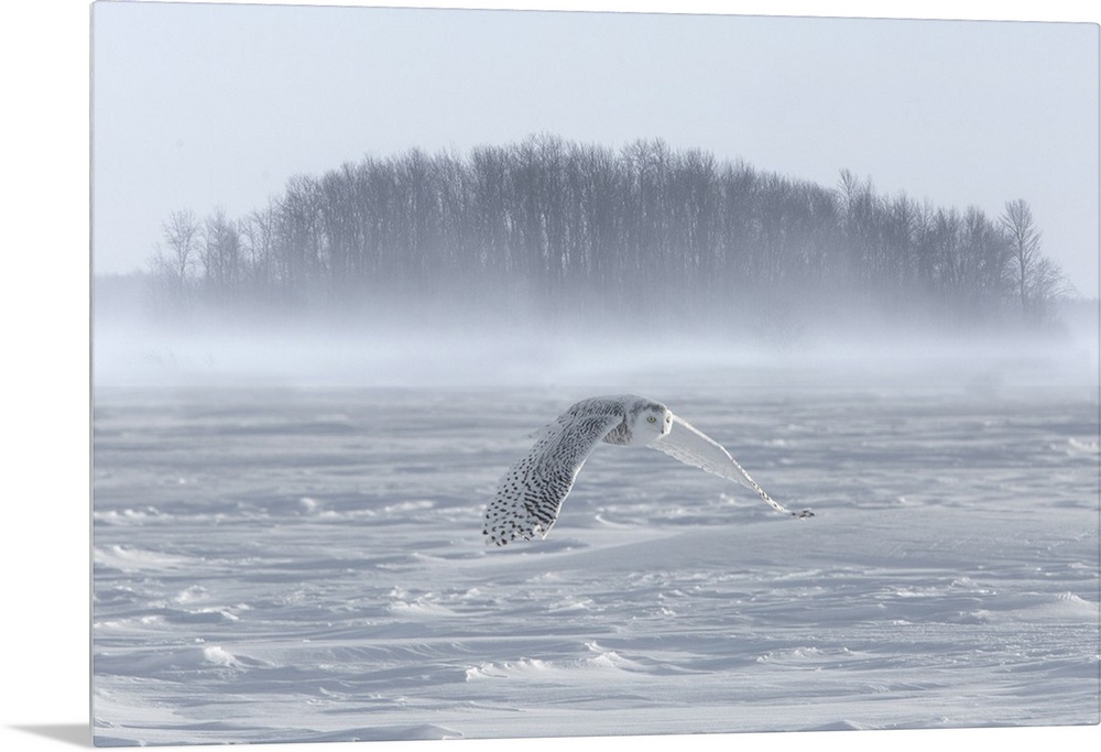 <p>Canada, Ontario, Barrie. Snowy owl in flight over water.</p>