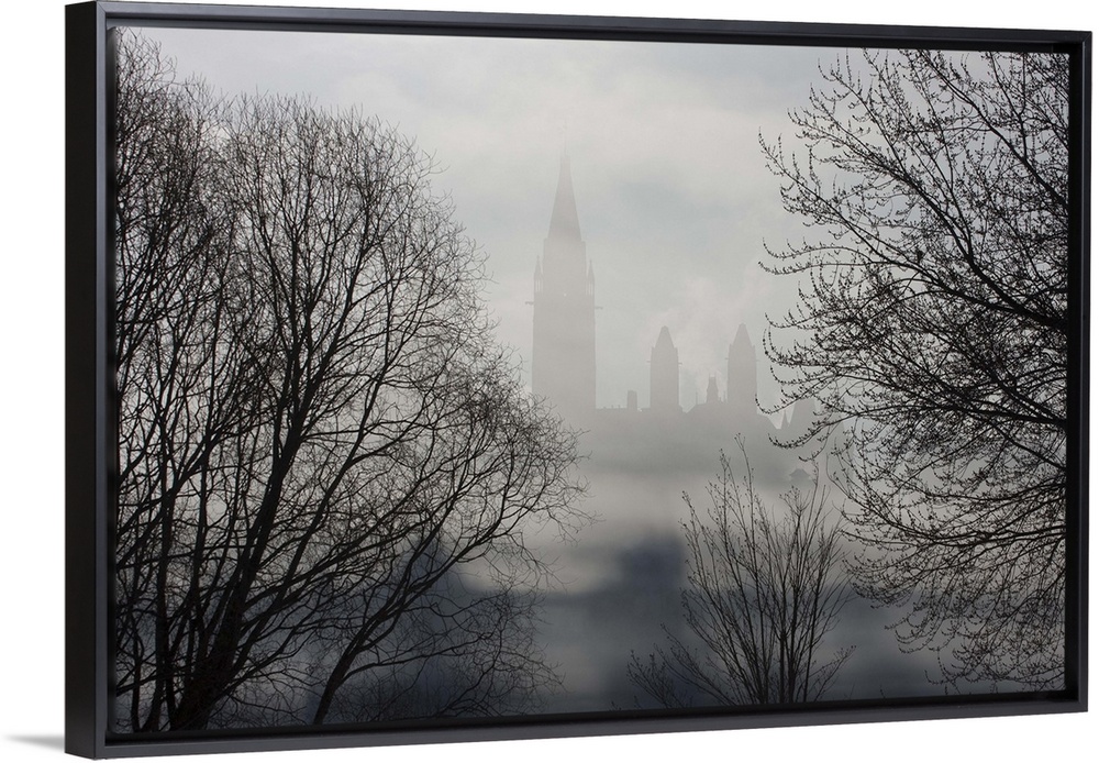 <p>Canada, Ontario, Ottawa. Parliament Buildings seen between trees and ice fog on Ottawa River. Credit as: Bill Young / Jaynes Gallery / DanitaDelimont.com</p>