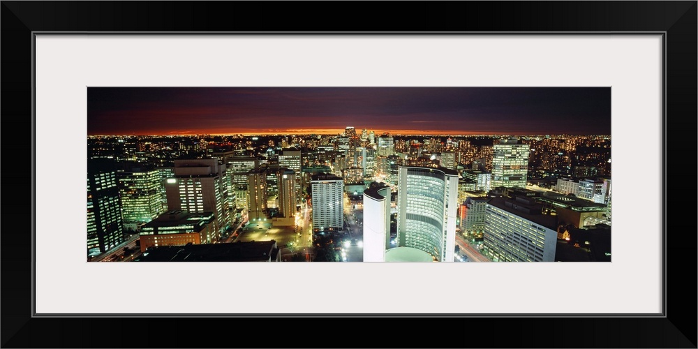 <p>This is a panoramic, landscape photograph taken from a roof top of the other skyscrapers in the city at night.</p>
