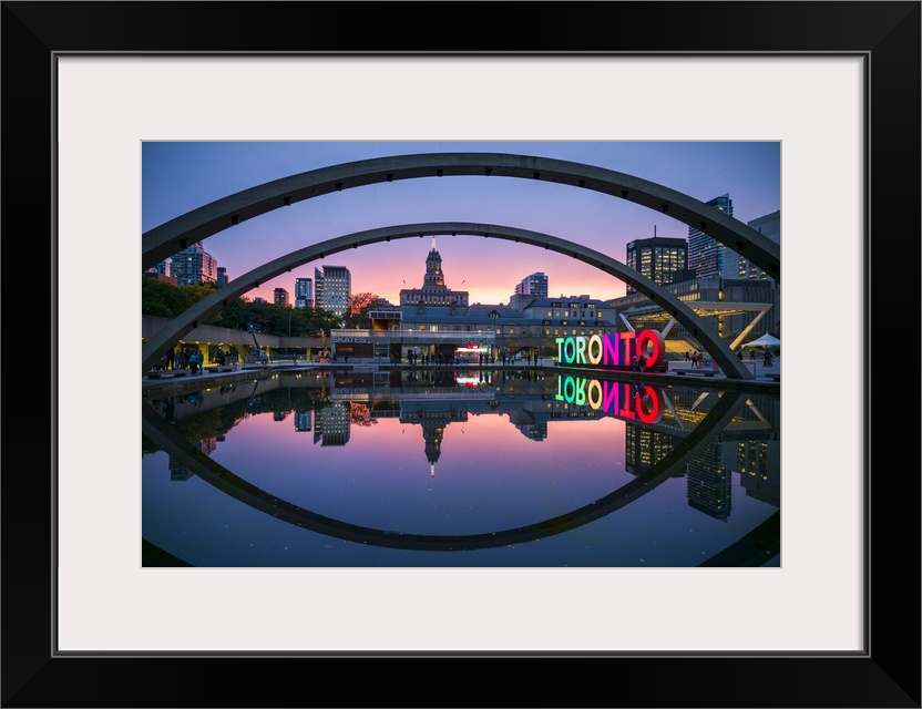 <p>Canada, Ontario, Toronto, Toronto Sign in Nathan Phillips Square by the City Hall, dusk</p>