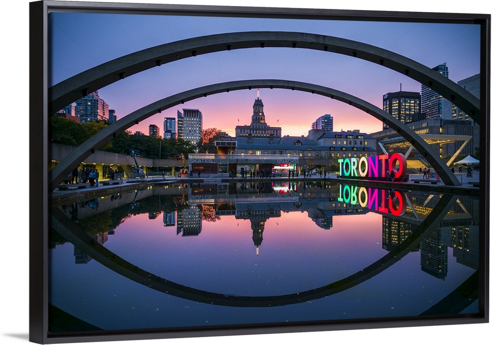 <p>Canada, Ontario, Toronto, Toronto Sign in Nathan Phillips Square by the City Hall, dusk</p>