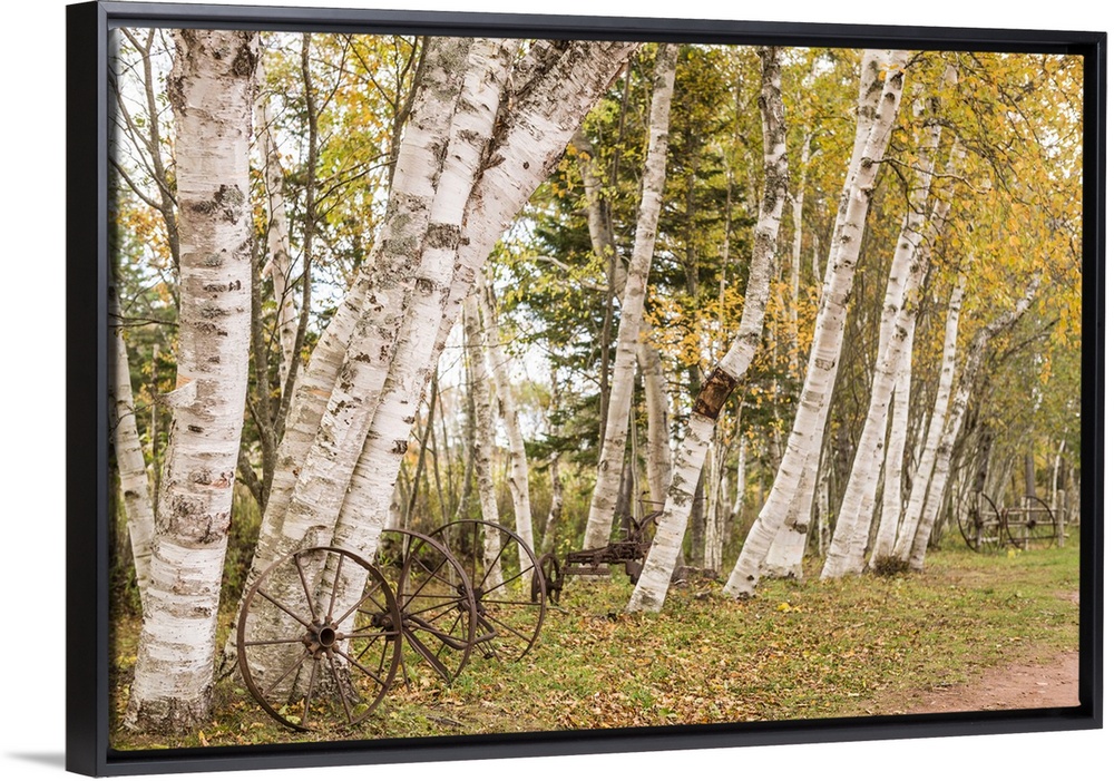<p>Canada, Prince Edward Island, Orwell, Wagon Wheel And Birch Trees</p>