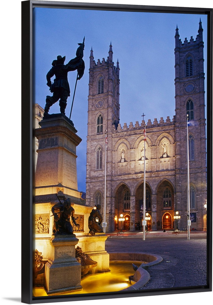 <p>Canada, Quebec, Montreal, Place d'Armes Square, Notre-Dame Basilica and Maisonneuve Monument of sculptor Louis-Philippe H..bert at dusk.</p>
