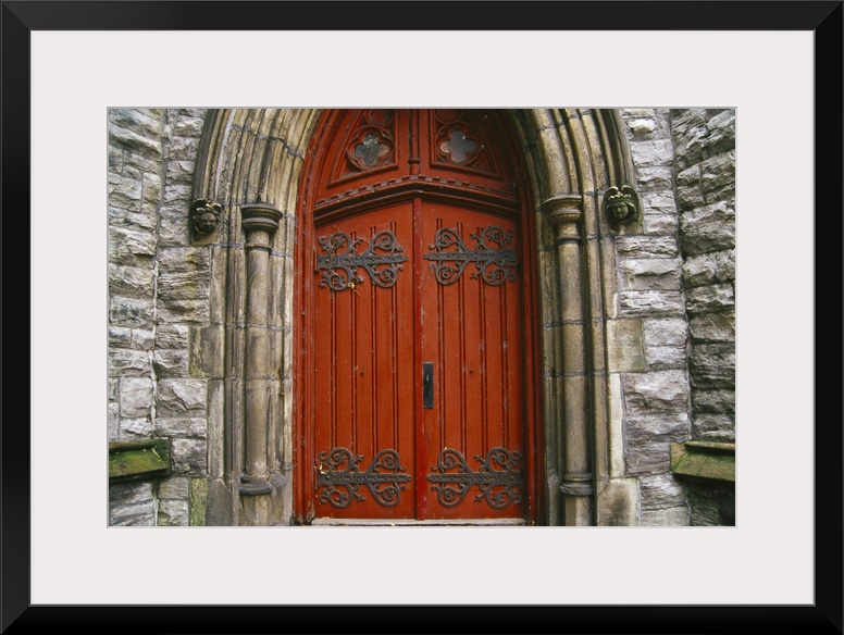 <p>Canada, Quebec, Montreal, St. George's Anglican Church or L'eglise St. George's, red door.</p>
