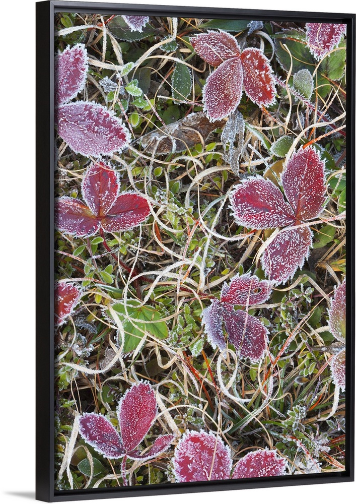 <p>Canada, Quebec, Mount St. Bruno Conservation Park. Frost-covered strawberry leaves.</p>