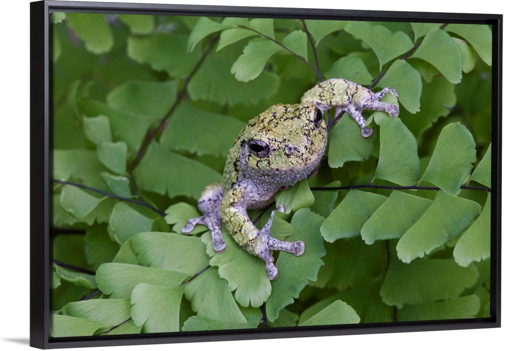 <p>Canada, Quebec, Mount St-Bruno Conservation Park. Gray tree frog on maidenhair fern.</p>