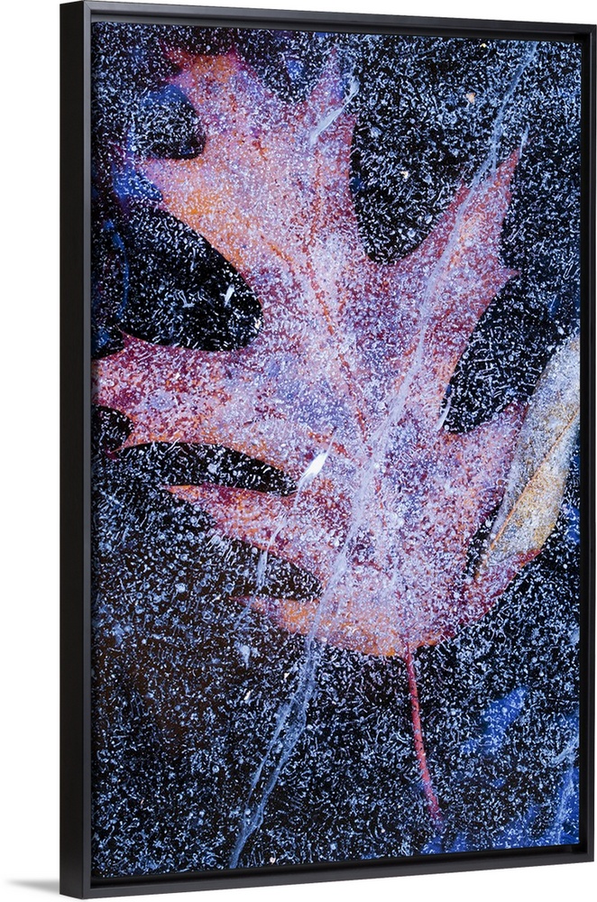 <p>Canada, Quebec, Mount St-Bruno Conservation Park. Red oak leaf under lake ice.</p>