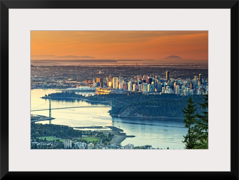 <p>Canada, British Columbia, Vancouver, View from Cypress Mountain of Lions Gate (First Narrows Bridge), West Vancouver, Stanley Park and downtown Vancouver at dawn</p>