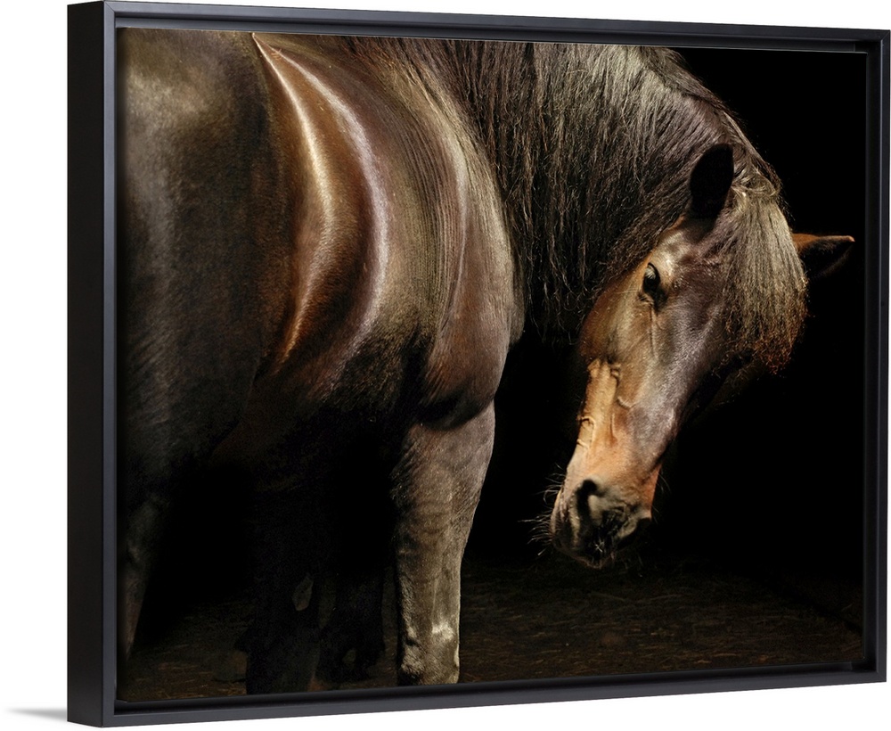 <p>Shimmering brown horse turns to look back in to the dark.</p>