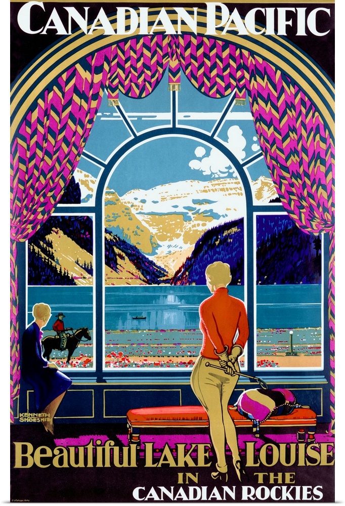 <p>Two women sitting at a window looking out onto Lake Louise in the Canadian Rockies. Canadian Pacific Railway (CPR) was incorporated on February 16, 1881. Less than five years later a ribbon of steel united Canada when the line to the Pacific coast was completed with the driving of the 'Last Spike' at Craigellachie, British Columbia, on November 7, 1885. By the 1920s, CPR had become known as the 'World's Greatest Travel System'. That slogan helped CPR promote its renowned transcontinental passenger trains, a chain of luxury hotels and a fleet of steamships. Since its beginnings, CPR commissioned many well-known artists and even went so far as to build an in-house team of graphic artists and printers to illustrate the company's vast empire. As a result, Canadian Pacific made a significant contribution to the art of poster design. Today, CPR operates on about 14,000 miles of rail lines in Canada and the United States and is among the largest freight railways in North America.</p>