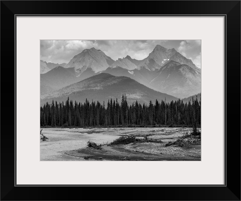 <p>Black and white landscape of the rugged Canadian rocky mountains with a forest and a flowing river in the foreground; Invermere, British Columbia, Canada</p>