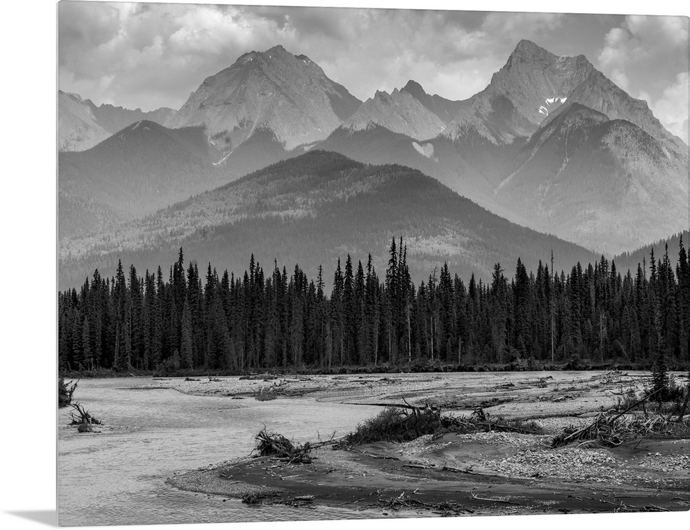<p>Black and white landscape of the rugged Canadian rocky mountains with a forest and a flowing river in the foreground; Invermere, British Columbia, Canada</p>