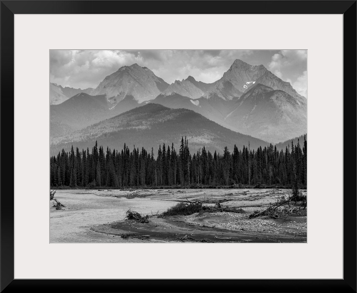 <p>Black and white landscape of the rugged Canadian rocky mountains with a forest and a flowing river in the foreground; Invermere, British Columbia, Canada</p>