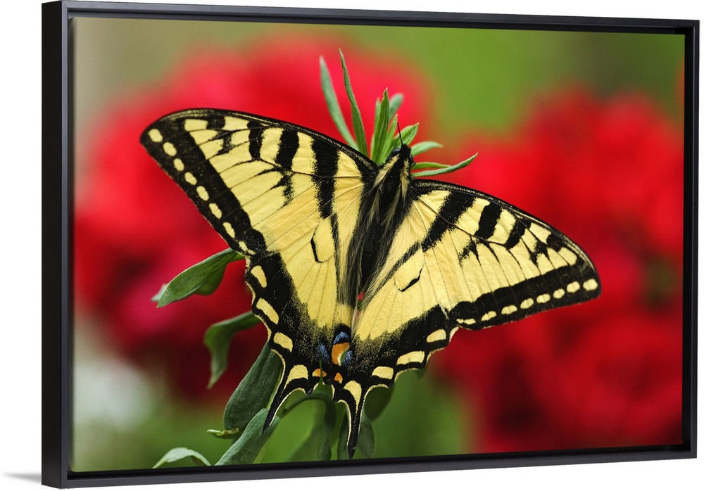 <p>Close Up Of A Canadian Tiger Swallowtail Butterfly With Red Geraniam Flowers In Background</p>