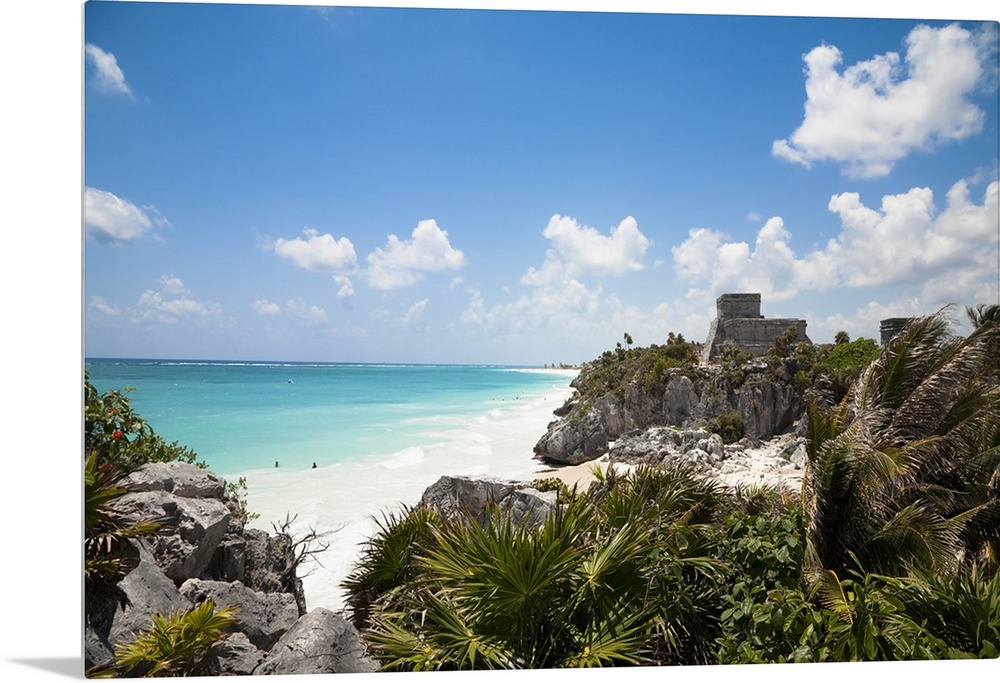 <p>Cancun, Quintana Roo, Mexico. A white sand beach behind tropical foliage. An old stone structure can be seen on a hill in the distance.</p>