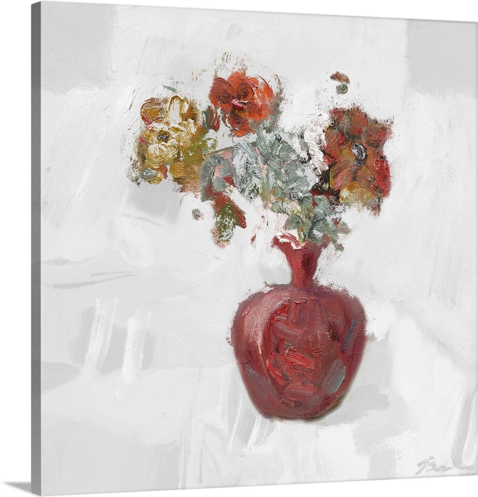 <p>Expressive still life painting featuring a vibrant bouquet of abstract flowers in a textured red vase against a luminous white background, rendered with bold, visible brushstrokes.</p>