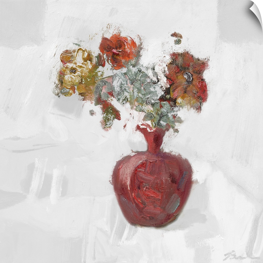<p>Expressive still life painting featuring a vibrant bouquet of abstract flowers in a textured red vase against a luminous white background, rendered with bold, visible brushstrokes.</p>