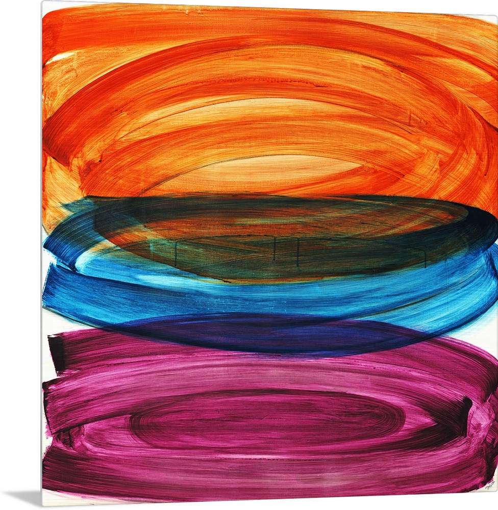 <p>Abstract painting of three large oval shapes that are vertically stacked, each in a different color and painted with thick circular brushstrokes.</p>
