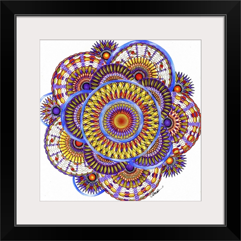 <p>A colorful square spiral graph in a floral shape in colors of yellow and blue.</p>