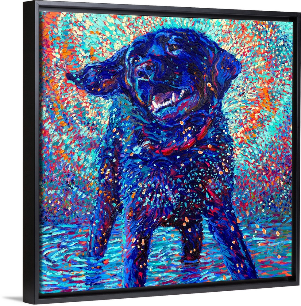 <p>Brightly colored contemporary artwork of a dog shaking off water.</p>