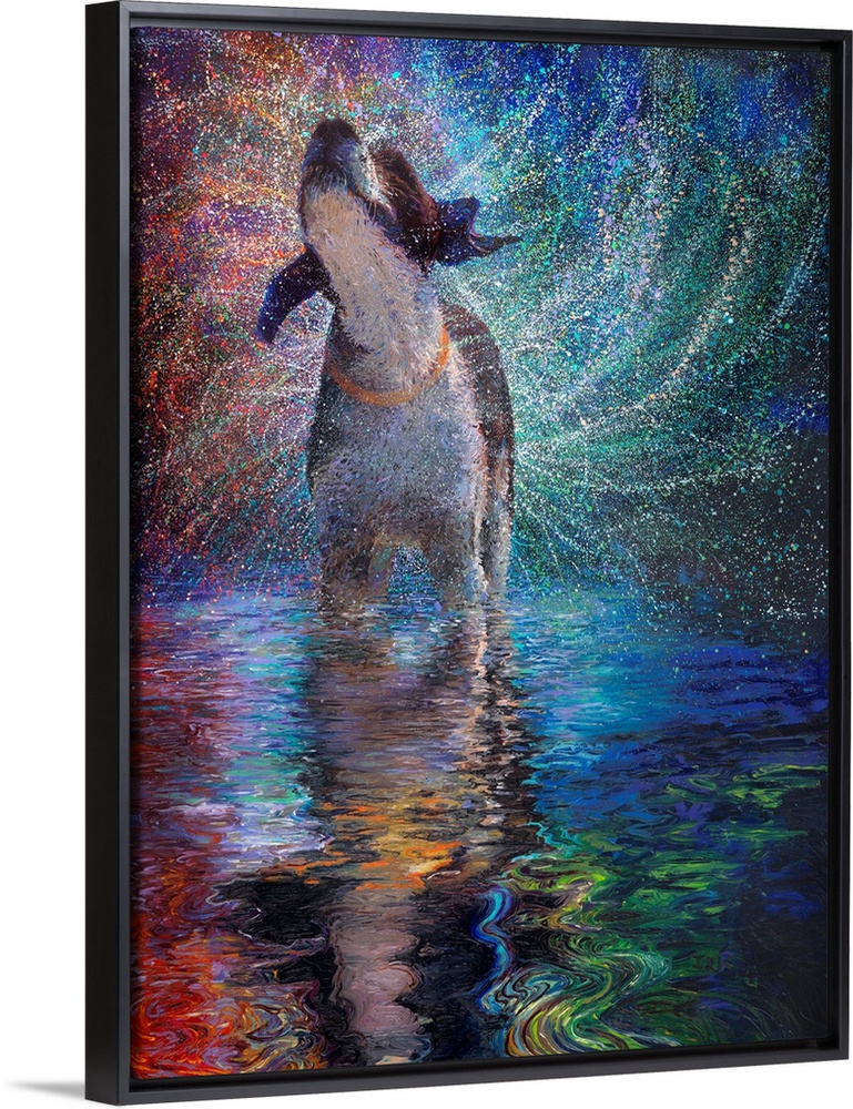 <p>Brightly colored contemporary artwork of a dog shaking off water with reflection.</p>
