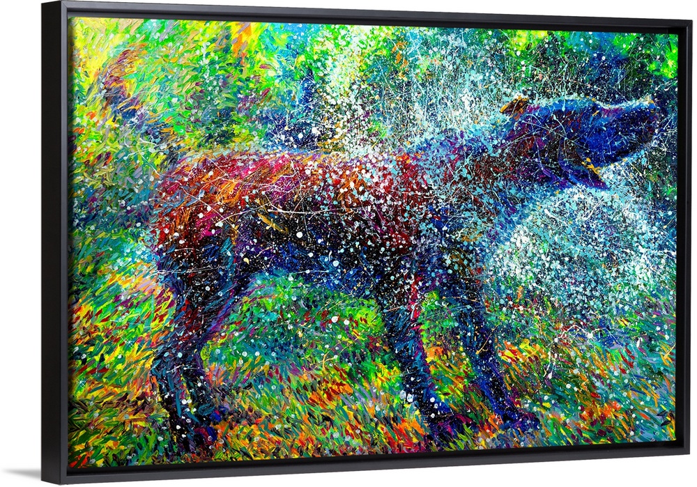 <p>Brightly colored contemporary artwork of a dog shaking off water.</p>