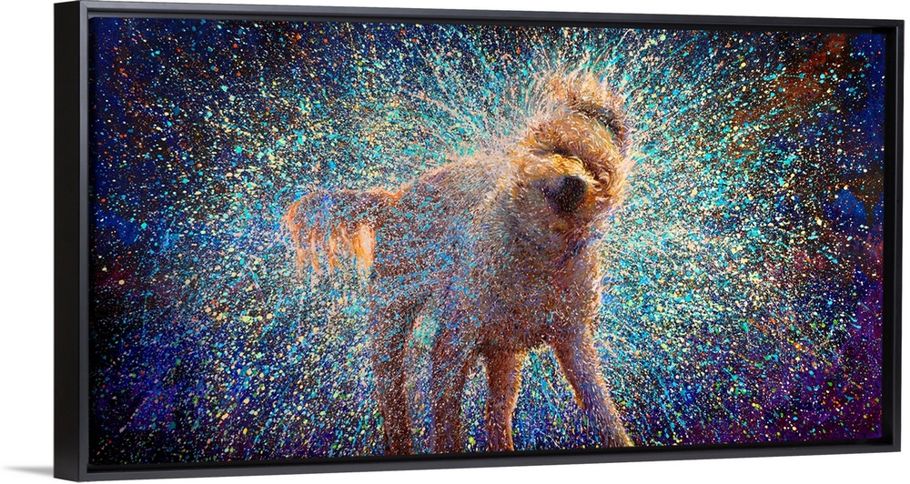 <p>Brightly colored contemporary artwork of a white dog shaking off water.</p>