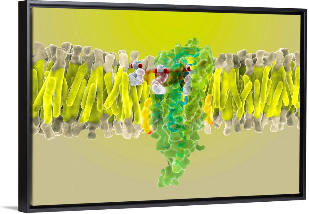 <p>Cannabinoid receptor binding. Molecular model of an anandamide molecule (mostly white, centre right) binding to a cannabinoid type 1 (CB1, green) receptor. CB1 is a G protein-coupled cell membrane receptor that is found mainly in the brain. Anandamide is a cannabinoid produced by body. The binding of anandamide to the receptor induces cellular responses inside the cell. Anandamide plays a role in memory, regulating feeding behaviour and motivation. CB1 receptors also bind THC, the active compound in the psychoactive drug cannabis.</p>