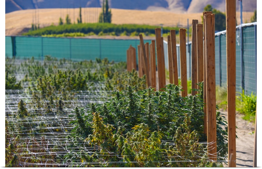 <p>Rows of Cannabis plants staked out and supported by nylon netting in outdoor growing facility in Colorado</p>