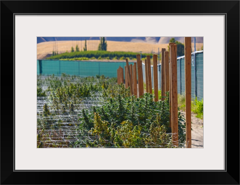 <p>Rows of Cannabis plants staked out and supported by nylon netting in outdoor growing facility in Colorado</p>