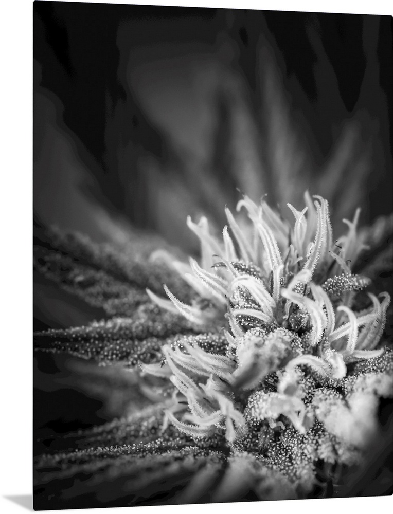 <p>Close-up of a maturing cannabis plant and flower with visible trichomes. Marina, California, united states of America.</p>