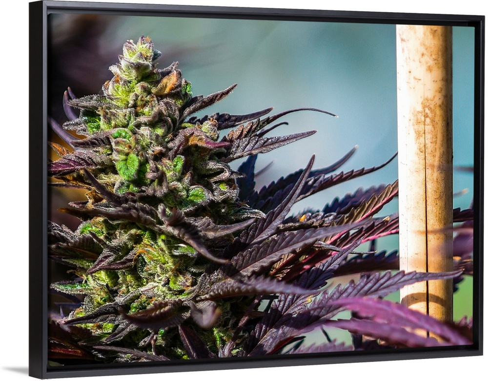 <p>Close up of a green and purple cannabis plant.</p>