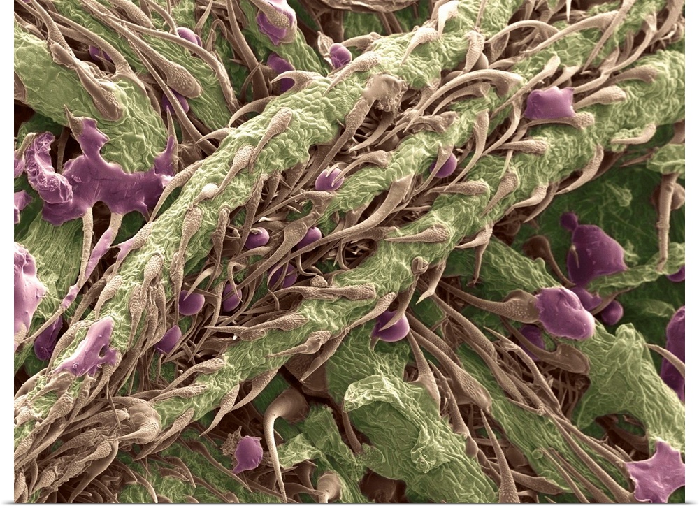 <p>Cannabis plant. Coloured scanning electron micrograph (SEM) of the surface of a cannabis (Cannabis sativa) plant. The pointed hairs are called lithocyst cells. They contain cystoliths (calcium carbonate crystals). Glandular cells called trichomes are also present. These are capitate trichomes tbat have stalks. These trichomes secrete a resin containing tetrahydrocannabinol, the active component of cannabis when used as a drug.</p>