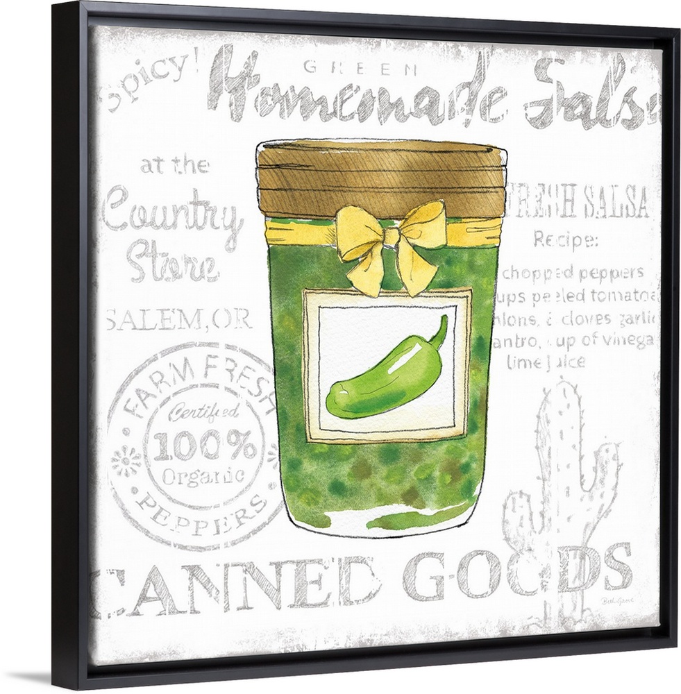 <p>Square kitchen decor with a watercolor illustration of a jar of salsa verde and black typography in the background.</p>