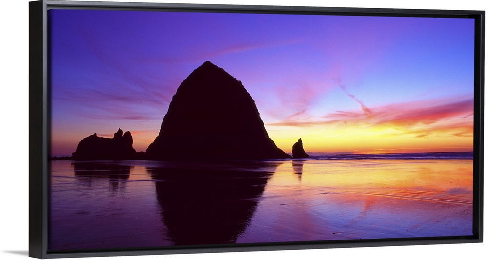 <p>Sea stacks on the beach silhouetted at sunset, Cannon Beach, Oregon.</p>