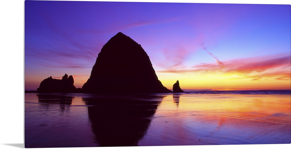 <p>Sea stacks on the beach silhouetted at sunset, Cannon Beach, Oregon.</p>