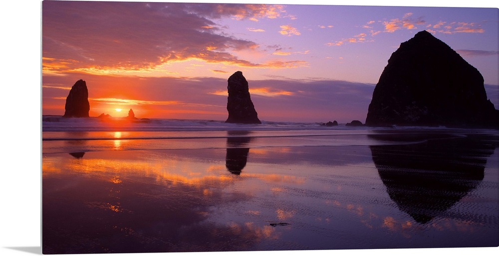 <p>Sea stacks on the beach silhouetted at sunset, Cannon Beach, Oregon.</p>